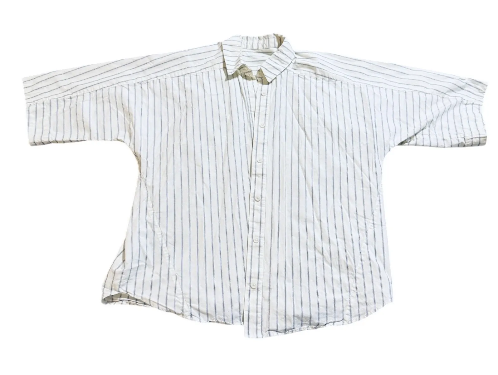 Pina Stripes Cream White & Navy Blue Women Size XS Oversized 100% Cotton Causal Short Sleeve Button Up Lightweight Sustainable Collared Boho 90s Retro Brand new without flaws. Needs steaming. Measurements: (flat lay) Chest ~ 22" Length ~ 25"