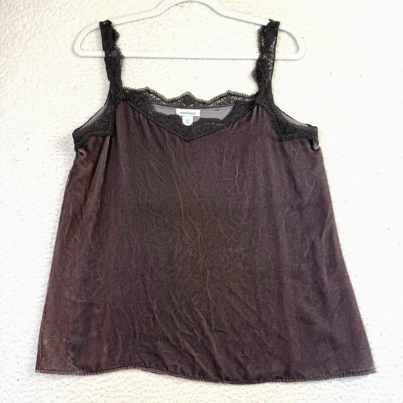 Brand: Sundance Condition: Gently worn with light overall wear and wrinkling from storage. Fabric, lining, and lace trim clean and intact; no flaws. Style: Womens camisole tank top with velvet-feel shell and lace-trimmed V-neckline and straps. Color: Brown solid. Size on tag: XS. Material: Shell 82% rayon, 18% silk (silk blend); exclusive of decoration; dry clean only. Made in China; RN# 86205. Details: Soft drapey fabric, fully lined interior, pullover design, delicate lace trim at neckline and shoulder straps, suitable for layering or loungewear. Keywords Only: Feminine Lagenlook Peasant Victorian Sexy Lacey