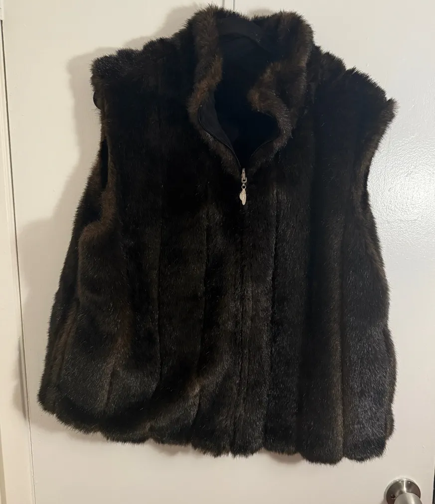 Luxurious dark brown faux fur vest. Perfect for adding warmth and style. Beautiful faux fur vest womens XL. Measures 24" pit to pit and 26" long. Excellent preowned condition.