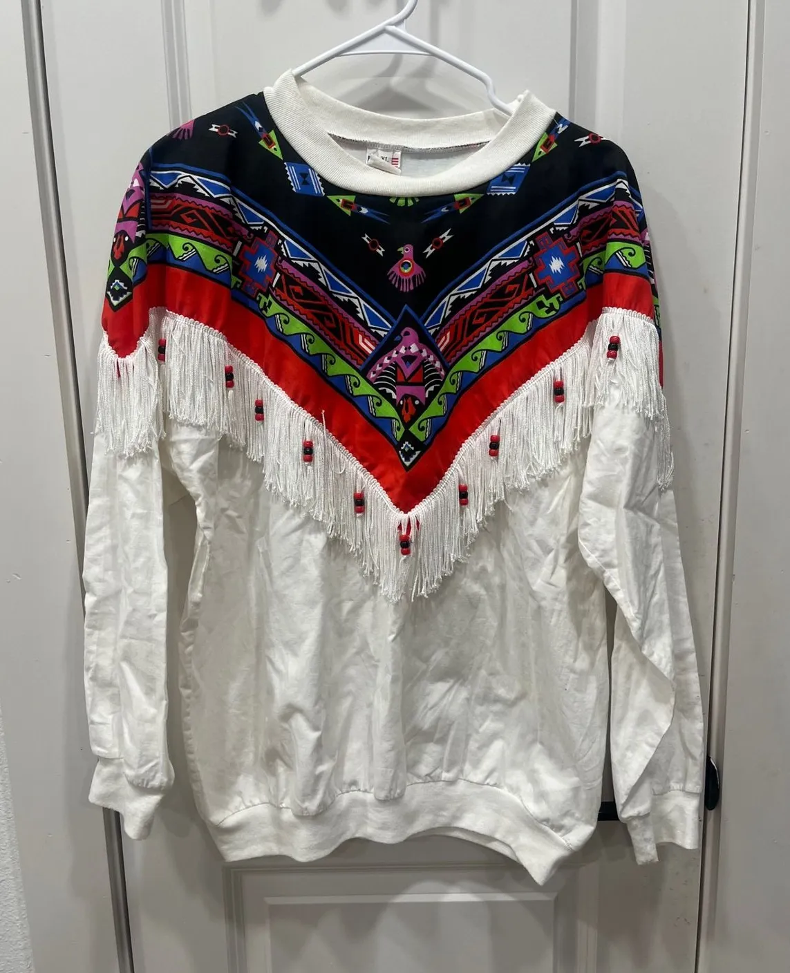 Embrace bold retro style with this eye-catching Western-inspired sweatshirt. Vibrant geometric patterns in striking black red green and blue adorn the yoke, creating a dynamic focal point. Cascading white fringe accents the shoulders and chest, adding playful movement and a touch of authentic Western flair. The classic crew neck and long sleeves provide comfortable coverage, making this piece perfect for channeling a unique vintage vibe. This sweatshirt is ideal for music festivals concerts or casual weekend outings. Measurements: • Chest: 23 in • Length: 26 in • Sleeve Length: 22 in Style: Pullover Department: Women Neckline: Crew Neck Theme: Western Sleeve Length: Long Sleeve Type: Sweater Features: Graphic Print, Fringe Pattern: Geometric Sleeve Type: Long Sleeve Fabric Type: Knit Accents: Fringe, Beaded Season: Fall, Spring, Winter Fit: Regular Occasion: Casual Garment Care: Machine Washable Keywords: Western, Southwest, Fringe, Sweatshirt, Retro, Boho, Festival, Cowgirl, Native American inspired, Statement piece, Unique, Vintage style
