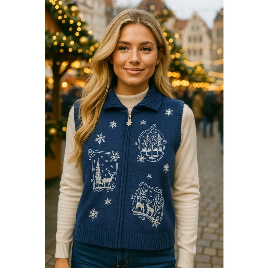 Southern Lady Snowflake Sweater Vest Christmas Navy Blue Embroidered M Parisian Size: Medium Please note: The first image in this listing is an AI-generated representation of a similar style to illustrate fit and aesthetic. The actual item available for purchase is shown beginning with the second photo in the listing. Description: Southern Lady navy blue zip-up sweater vest featuring intricate white snowflake embroidery and winter forest scenes with deer. Finished with a metallic snowflake zipper pull and a soft ribbed knit trim for comfort. Perfect for layering during the holiday season, offering a cozy yet polished festive look for Christmas parties, winter markets, or casual gatherings. Style Profile: vintage Christmas sweater vest, winter wonderland aesthetic, cozy snowflake embroidery, holiday layering essential, retro festive knitwear, Christmas market chic, cottagecore holiday fashion, Scandinavian winter style, Cool Winter color palette, polished grandma-core, nostalgic winter layering, cozy cabin fashion, festive chic aesthetic, upscale Christmas vintage, boutique knit vest, bougie holiday layering, reindeer embroidery fashion, minimalist festive elegance, timeless navy knitwear, collectible Christmas sweater Color Season: Cool Winter 2238