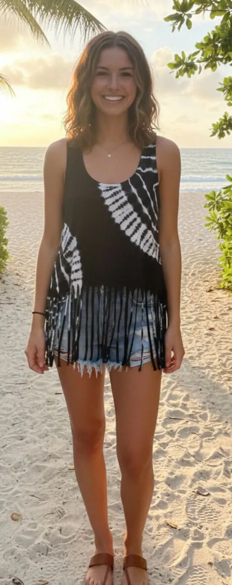 Southern Spirit white & black tie dye, cropped tank top with bottom fringe accent. EUC! Worn once. 100% Cotton Size: Large Length: 18” ( from top shoulder to bottom hem ) Length: 28” ( from top shoulder to bottom of fringe ) Pit to Pit: 16”