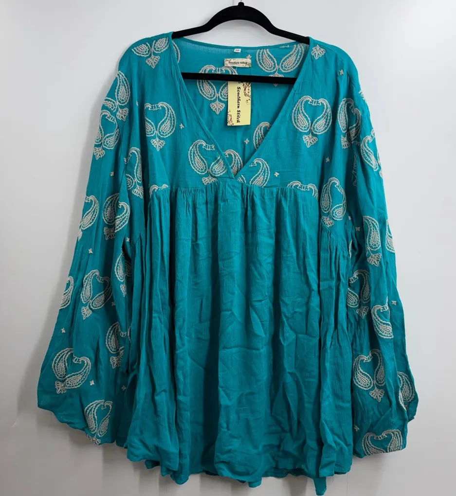 Southern Stitch teal blue embroidered boho babydoll tunic blouse top plus size XXL NWT New with tag approximate hand measurements pit to pit: 31" length: 34" Women's V-neck, long bell sleeve, bohemain style tunic top in teal with off white embroidery, flowy fit 100% viscose Beautiful Southern Stitch boho tunic blouse in a rich teal color with intricate embroidered paisley detailing throughout. Features a flowy babydoll silhouette, flattering V-neckline, and long balloon sleeves for an effortless bohemian look. Lightweight 100% viscose fabric offers a soft, airy drape—perfect for casual wear, festivals, or resort styling. Perfect paired with jeans, leggings, or boots for a chic boho outfit. southern stitch blouse, boho tunic top, embroidered paisley blouse, teal boho top, babydoll tunic, peasant blouse, festival top, hippie chic blouse, flowy viscose top, long sleeve boho, oversized boho top, gypsy style blouse, boutique boho, resort wear top, cottagecore boho