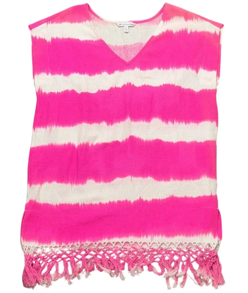Vibrant pink and white tie-dye top with fringe detailing. Perfect for a casual day out.