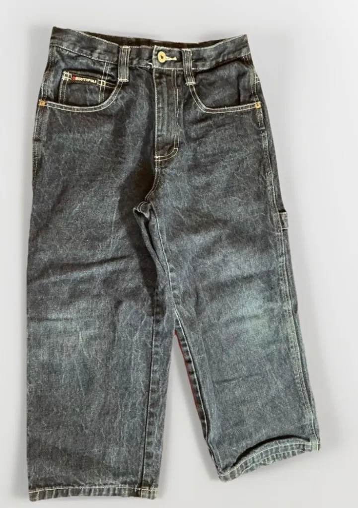 Good preowned condition. No flaws noted Southpole women’s carpenter capri jeans Authentic Collection, Y2K streetwear vibe Classic 5-pocket with utility carpenter side pocket Capri cropped length with wide leg opening Washed black denim with contrast stitching Approximate measurements laying flat then doubled when applicable Waist: 27”; Rise: 10 3/4”; Inseam: 21 1/2”; Leg opening: 17”; Length top waist to bottom hem: 31” ⸻ Southpole jeans, carpenter jeans, capri jeans, Y2K denim, streetwear, workwear jeans, utility jeans, cropped jeans, wide leg jeans, size 10 jeans