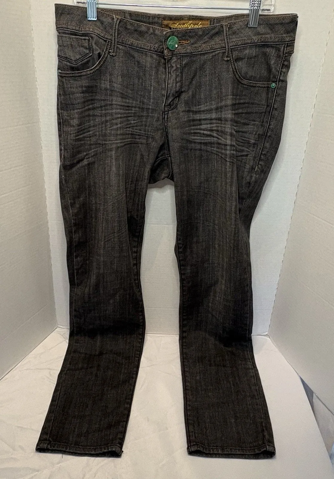 The Southpole Women's Premium Jeans in Gray Green with Belt Strips and Rhinestones in size 13 featur... Show more
