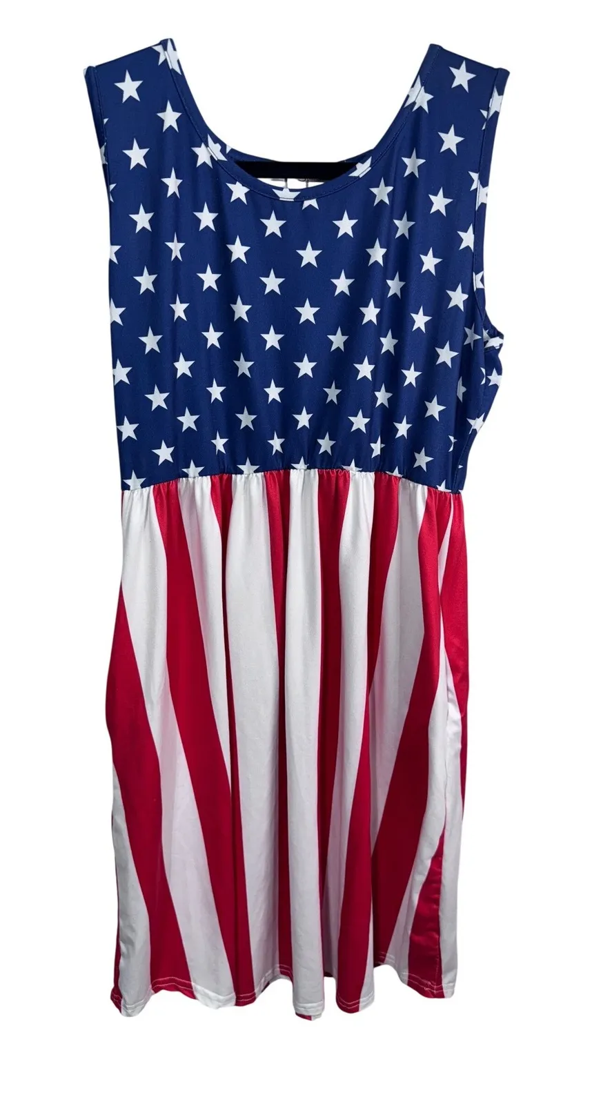 A patriotic American flag dress perfect for celebrating holidays or expressing national pride. This sleeveless dress features a vibrant star pattern on the bodice and bold red and white stripes on the skirt, creating a festive and eye-catching look. The elasticized waist ensures a comfortable and flattering fit. Ideal for Fourth of July celebrations, Memorial Day events, or casual summer outings. Measurements: • Chest inches: 17 • Length inches: 35.5 Style: Sundress, Tank Dress Dress Length: Knee Length Department: Women Sleeve Length: Sleeveless Pattern: Stars Occasion: Casual, Party/Cocktail Material: Polyester, Spandex Fabric Type: Jersey Theme: Patriotic, Stars Neckline: Round Neck Season: Summer Sleeve Type: Strappy Sleeve Closure: Pullover Keywords: patriotic, USA, 4th of July, summer dress, sleeveless, star print, stripe print, casual, festive, holiday, themed, mini dress, comfortable