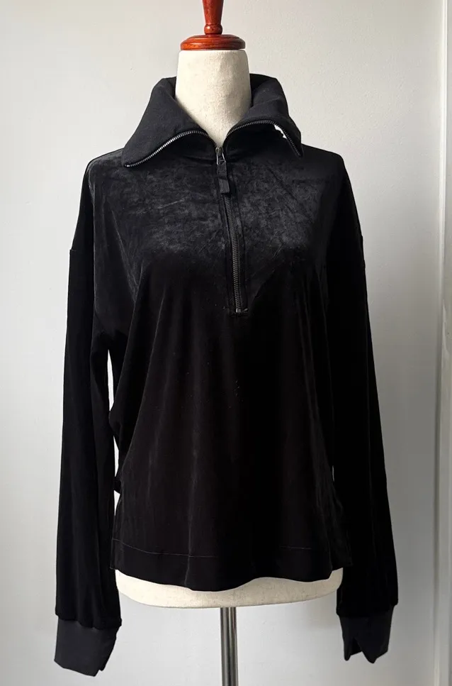 Elegant black velour pullover with a stylish high collar and split hem. Features a convenient half-z... Show more