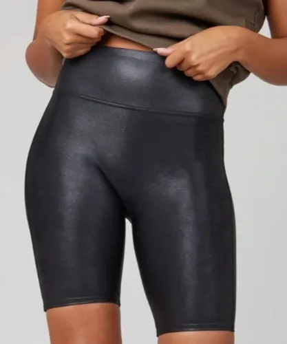 Keywords: Spanx, bike shorts, high waist, faux leather, metallic, shine, stretch, athleisure, workout, fashion, women's shorts, black shorts, statement piece, night out, comfortable