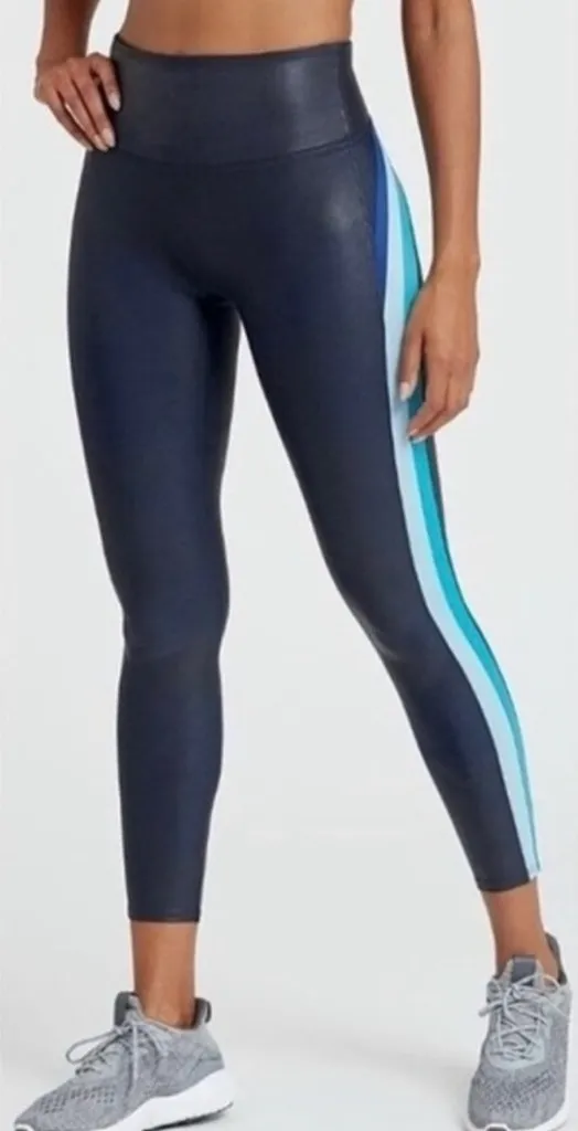 Chic leggings with a dark base. Features blue and teal side stripes. Ideal for play and style. Preo... Show more