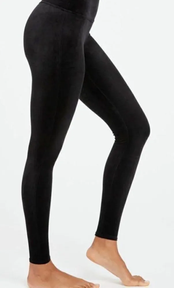 . They feature a high-waisted, seamless design with a velvet-like finish, offering both comfort and style. The leggings are black and manufactured in Vietnam. Condition is pre-owned.