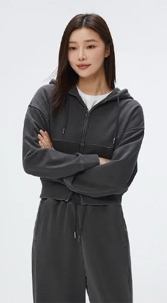 The product is a SPAO Women's Long Sleeve Crop Zip-up Hoodie in charcoal grey, size M. It is designed for women as activewear, featuring a full zip style and long sleeves. This hoodie is perfect for those looking for a stylish and comfortable option for their active lifestyle.