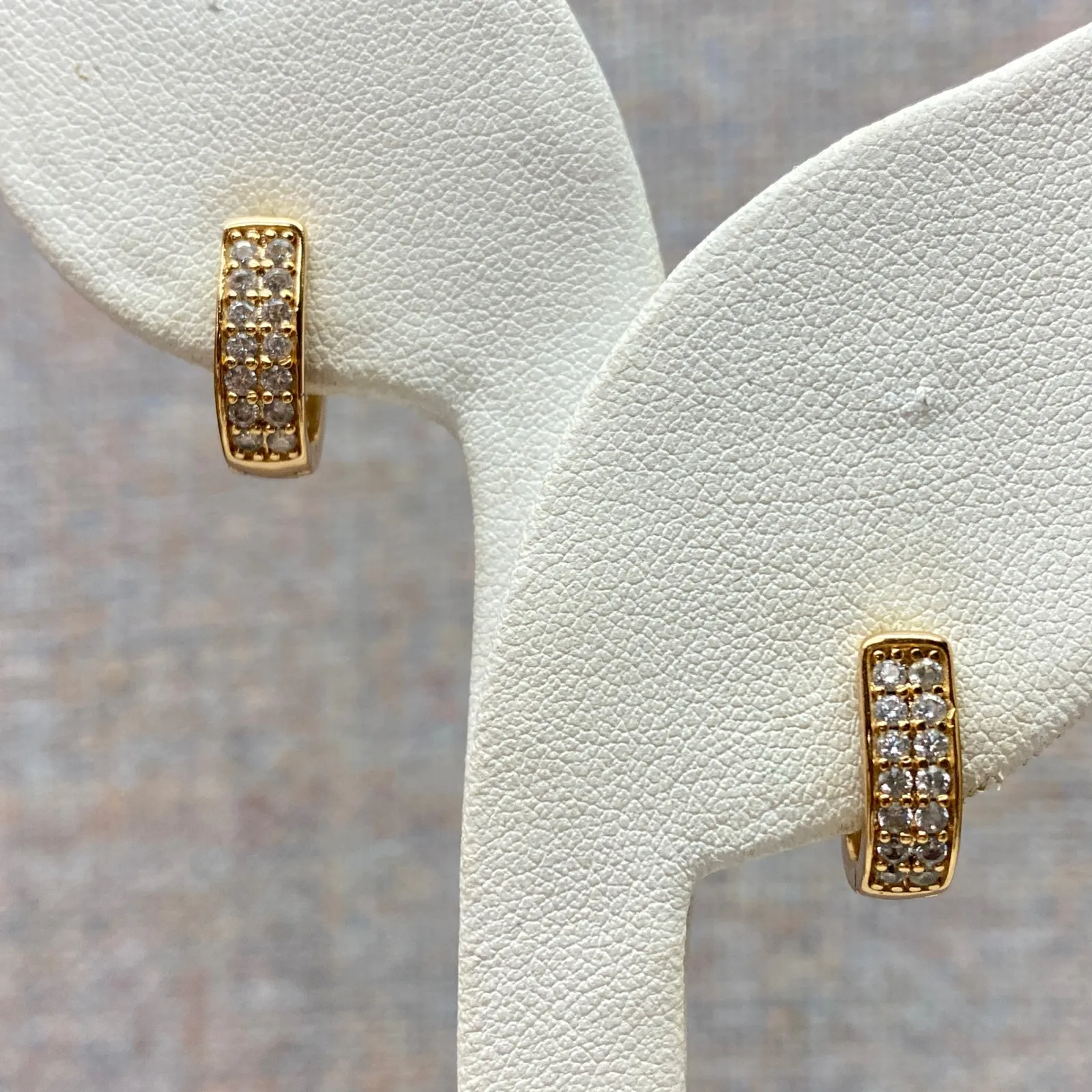 Preloved in excellent condition Please see all photos for close up details and measurement. Style: Huggies, Hoop Main Stone Color: White/Colorless Closure: Hinged Metal: Yellow Gold Shape: Oval Type: Earrings Material: Rhinestone Main Stone Shape: Round Setting Style: Pavé Ear Area: Lobe Secondary Stone: Cubic Zirconia Number of Gemstones: 21 Keywords: gold earrings, CZ earrings, hoops, sparkling, everyday, glamour, chic, elegant, fashion, accessories, gift, studs, fashion jewelry