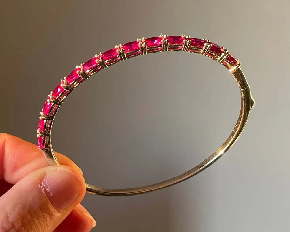 A stunning tennis bracelet adorned with vibrant pink gemstones. This elegant bangle features a delicate gold-tone finish, perfect for adding a touch of sparkle to any outfit. Its classic design makes it a versatile accessory for special occasions like anniversaries or formal events, or as a sophisticated everyday piece. Measurements: • Inner Circumference: 6.5 in Style: Bangle Type: Bracelet Main Stone Color: Pink Shape: Round Main Stone Shape: Oval Setting Style: Prong Era: Undated Gemstone Clarity Grade: Eye Clean Unit Type: Unit Keywords: pink bracelet, gemstone jewelry, fashion bangle, women's accessories, elegant bracelet, gold tone jewelry, sparkly bracelet, statement bracelet, party jewelry, gift for her, anniversary gift, bridal jewelry