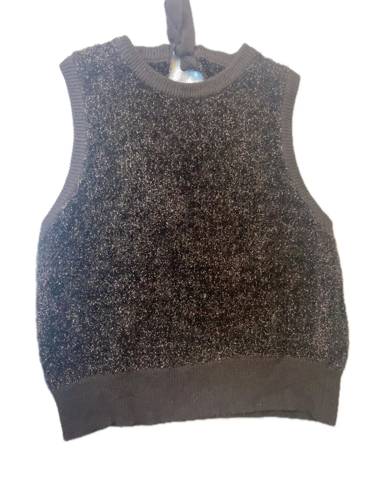 Sparkly black knit sweater vest with a metallic shimmer throughout. The sleeveless design features a crew neckline and a ribbed hem. A tie detail at the back adds a unique touch. Measurements: • Bust: 19.5 in • Length: 24.75 in • Waist: 17.25 in Style: Vest Department: Women Material: Polyester, Spandex Neckline: Crew Neck Sleeve Length: Sleeveless Type: Sweater Features: Collarless, Adjustable Pattern: Solid Fabric Type: Knit Accents: Bow, Glitter Knit Style: Tight-Knit Season: Fall, Winter Fit: Regular Occasion: Casual, Party/Cocktail Keywords: metallic knit, glitter vest, shimmer top, sleeveless sweater, party top, evening wear, NYE outfit, holiday fashion, textured knit, sparkle accent, layering piece