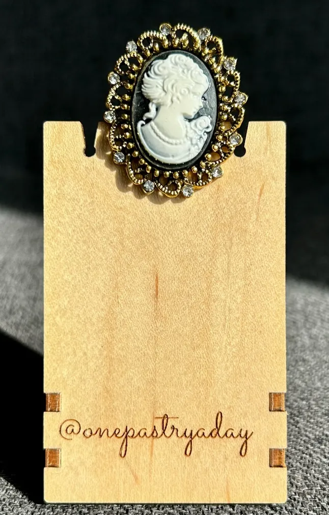 Pretty fashion (I don’t see any markings) cameo brooch with antiqued gold tone filigree edging and crystal rhinestone details. Cameo has black background…perfect any season but especially for the holidays for something different! Wear on jackets, blazers, bags, backpacks, hats…use as a button to keep your cardigan closed! So many creative ideas. Great as a gift to self or loved ones! 🎁 😍 EUC (comes in gift box) Size: ~1.5 x 1 inches Measurements: see pics, if avail Pet-free and smoke-free home.