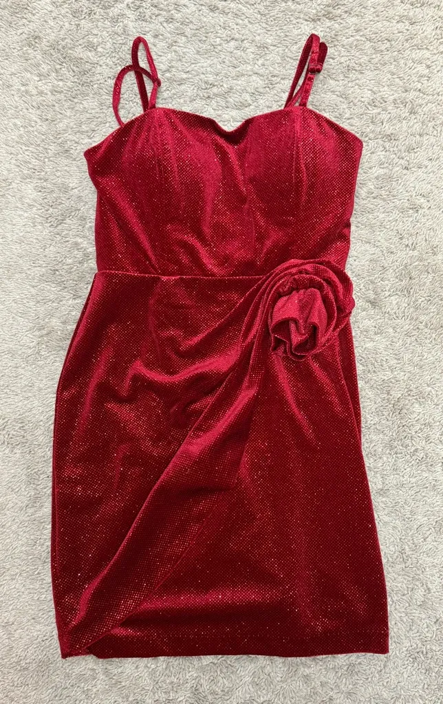Description: Stunning sparkly crimson red dress in juniors size 1/2, worn only once for a Valentine’s dance and still in excellent condition. It features sewn-in supportive cups for a flattering shape, adjustable spaghetti straps, and a secure zipper-back closure with hook fastenings. The fabric is 94% polyester and 6% spandex, giving it a soft velvet-like feel with a comfortable stretch. Gorgeous, eye-catching, and perfect for dances, parties, or any special occasion! Smoke free home.