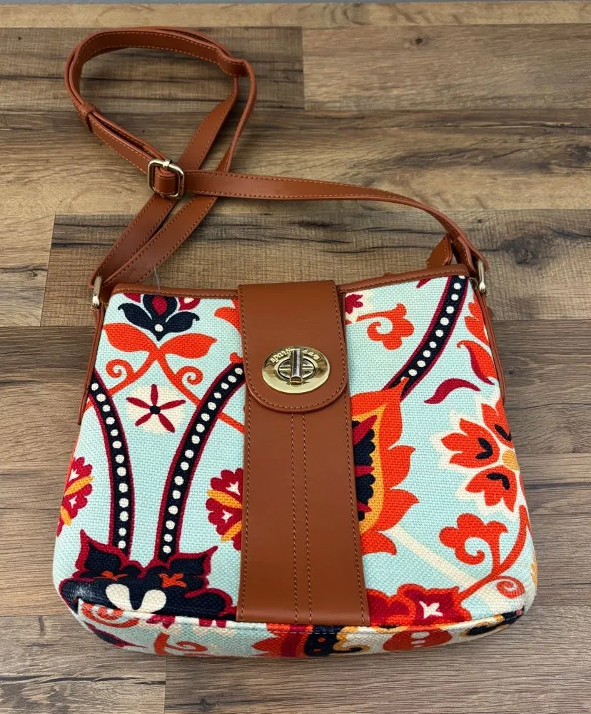 . Very good condition. Very clean. No holes. No stains. Bright and colorful. Crossbody strap is adjustable. Strap is in excellent condition - no flakes or stripping. Color: Tan Orange Light Blue Size: 10”x9”x2.5” Non smoking home 🏡 I am open to offers! ❤️