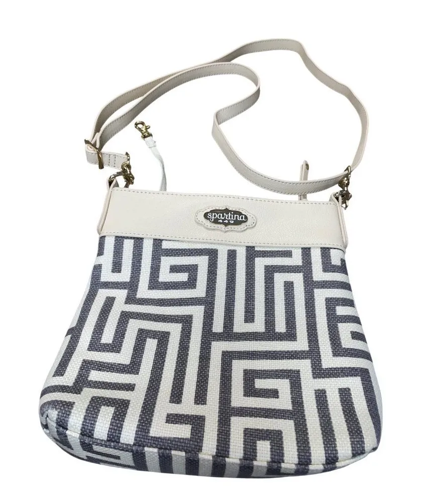 Spartina 449 is a stylish and functional crossbody bag featuring durable leather and linen material, elegant geometric design, and convenient adjustable strap for hands-free carrying. It is in very good condition with no defects noted. SKU 9452 • Adjustable strap with secure clasps • Durable canvas construction • Lightweight and compact design • Interior lined for added protection • Elegant faux leather trim accents Features: • Casual formal wear • All season • geometric • Spot clean only Size: Womens M Condition: Pre-Owned Good No defects noted in very good condition in and out.