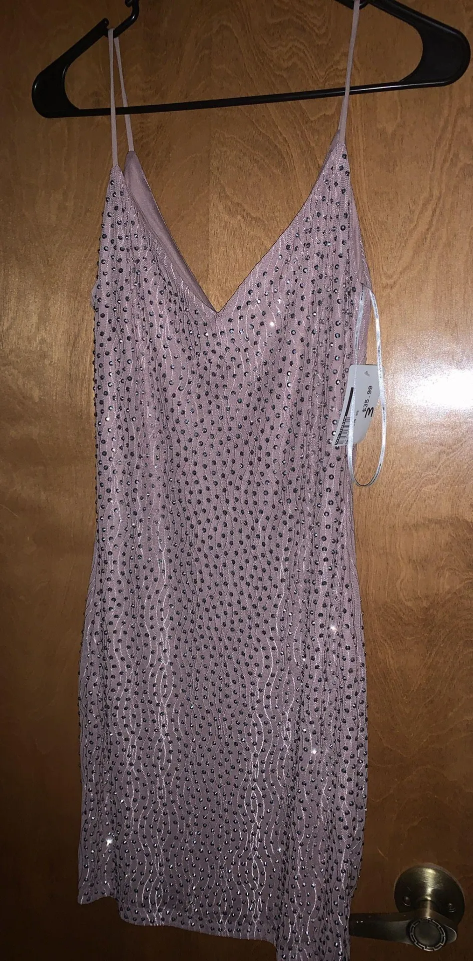 pinkish dress with pearls on it, it’s a size 3, very comfy dress for homecoming or a night out