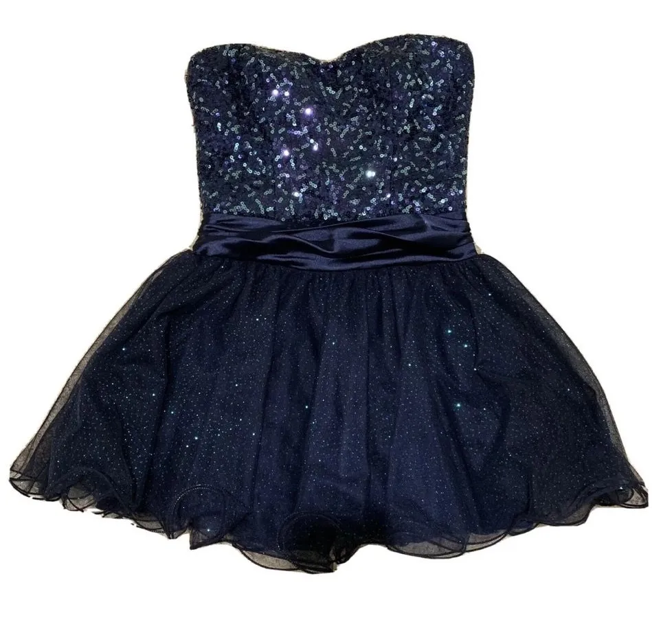 Speeckless Navy Formal Dress For Prom/wedding/Special Events Junior Size 11 . Top is covered with different shades of blue sequins. Silky dark blue belt separates it from the tutu style layered skirt covered with shiny blue sparkles. Zipper works perfectly well. Approximate measurements lay flat: armpit to armpit 16.5 inch waist side to side 14 inch skirt length from belt down 14 inch Thank you for considering this item! Excellent. No issues