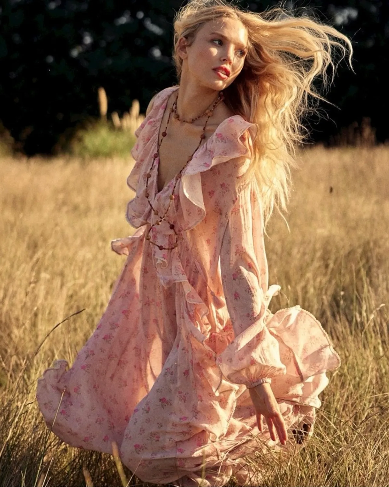 Free People X Spell & the Gypsy Fleur Gown MSRP $349 Size Medium Laying Flat / Approximately Armpit to Armpit 22” Waist 20” Length 50” 54” Excellent Preowned Condition Style No. 88900238; Color Code: Effortlessly ethereal, this billowy dress is featured in a printed fabrication and shapeless silhouette with a plunging V-neckline and frilly ruffled trim. Fit: Shapeless silhouette, A-line style Features: Organic cotton-blend, printed detail all over, plunging V-neckline with adjustable drawstring detail, covered buttons, frilly ruffled trim, balloon-inspired long-sleeves with elasticated cuffs, unlined Why We ❤ It: This feminine dress pairs perfectly with your favorite strappy heels or bold boots for versatile outfitting. The Fleur Gown in Pink Champagne is dramatic, commanding attention with exaggerated features and a dreamy allure. Our Gown is unlined and intentionally sheer with cascading frills that allow a little modesty for the modern woman. 50% LENZING™ ECOVERO™ Viscose, 50% Organic Cotton