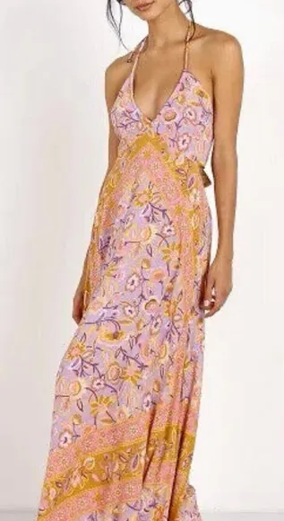 The Lolita halter gown in classic Spell 70's inspired print' in pink, lavender and ochre Size Small Like New! The inside material tag is missing a few stitches or can just be cut off! perfect for those cooler nights by the fire or dancing under the stars at a festival.