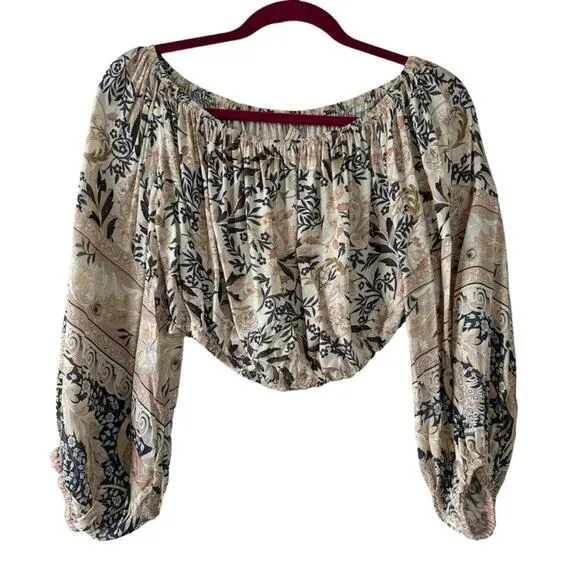 Features: Spell & The Gypsy Pearl Oasis Off the Shoulder Cropped Floral Blouse; boho style top, metallic stitching details, long sleeves, elastic around the shoulder and the waist. 98% rayon, 2% Lurex. Size: small Condition: New without tags gifts for her, casual, chic, relaxed, stylish, trendy, feminine, bohemian, festival, beach, summer, spring, vacation, metallic
