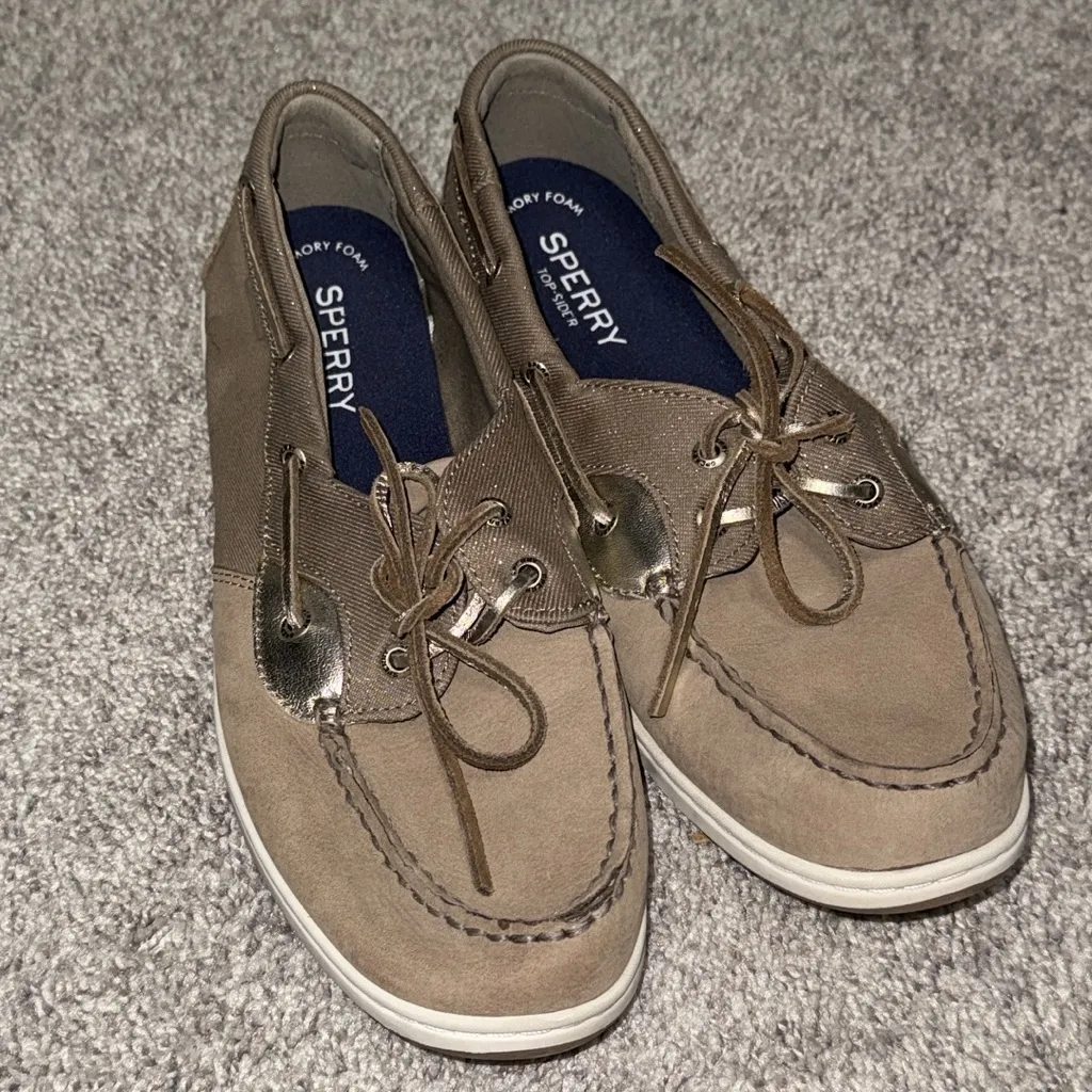 Made in Indonesia SPERRY Top-Sider memory foam women’s size 9.5 slip on tan gold glitter accents