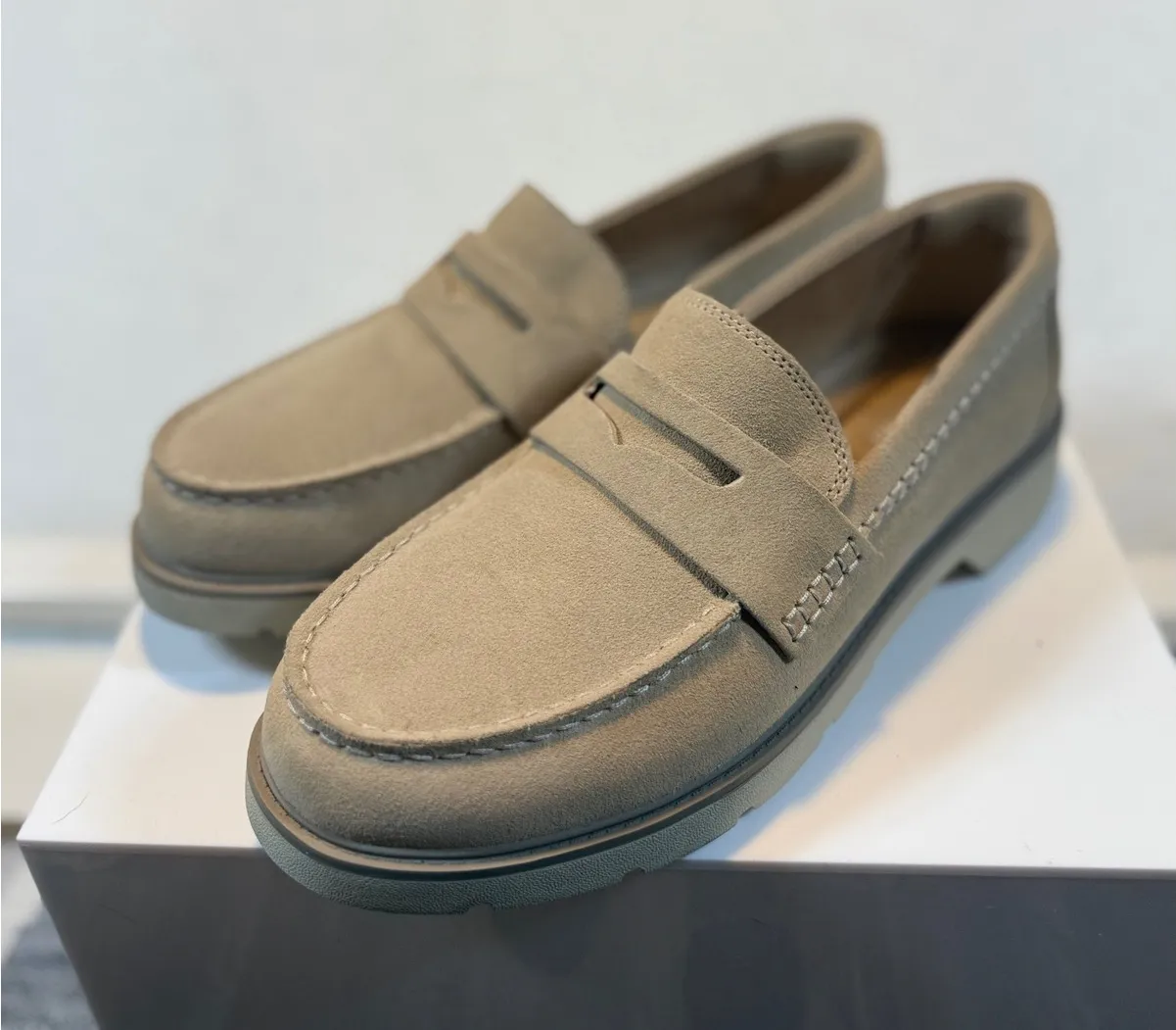 Women's beige suede slip-on loafers. These comfortable shoes feature a classic loafer silhouette wit... Show more