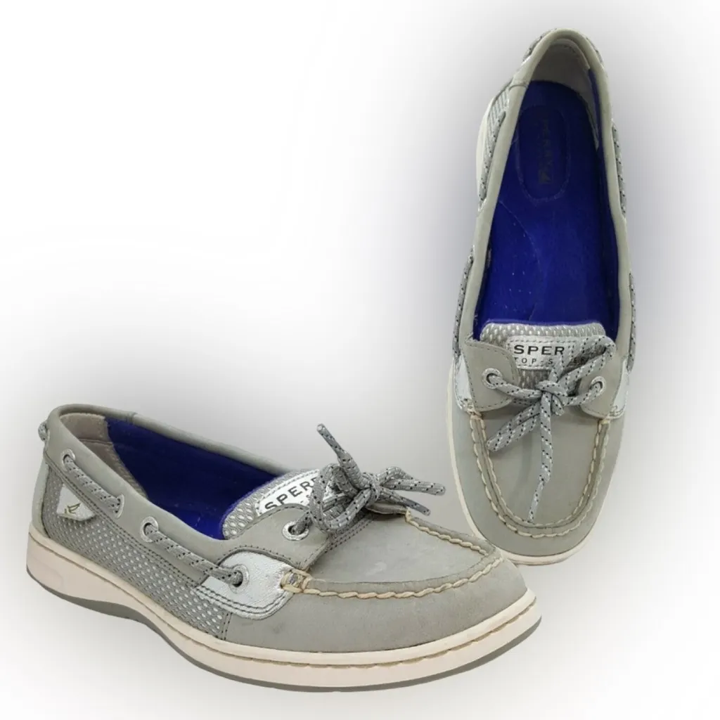 Step up your style game with these silver Sperry Top-Sider boat shoes. The slip-on style and round t... Show more