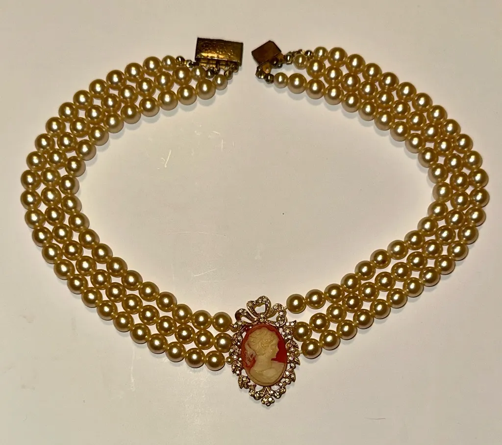 Beautiful vintage SPHINX triple-strand faux pearl choker featuring a raised cream + coral cameo set... Show more