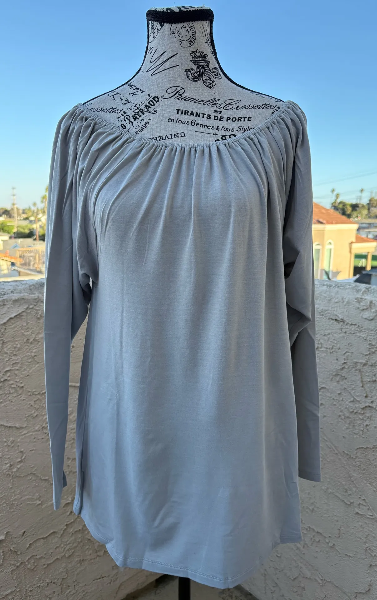 Spiegel graceful Jersey blouson top from the brand’s signature luxury fabric collection, size extra small. Brand new with tags, in flawless condition! Made of 95% rayon and 5% spandex. Color is soft grey.