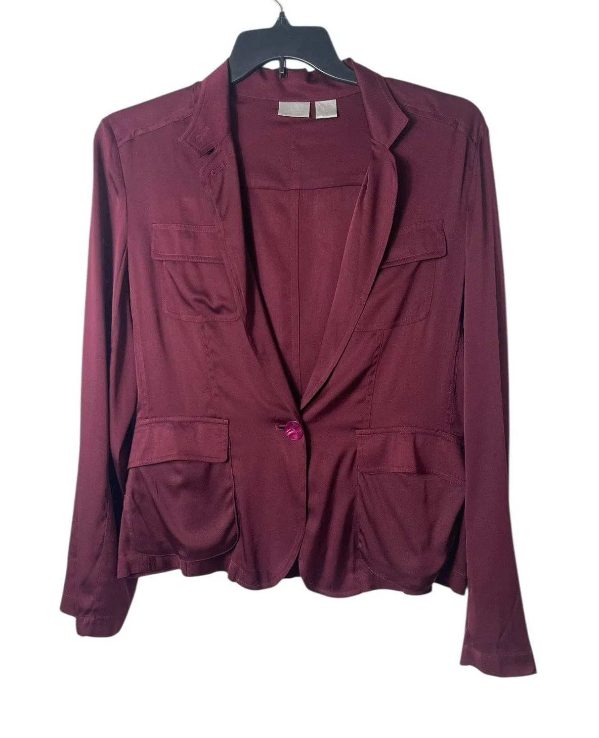 This Spiegel Silk Blend Blazer Top in Women's size 18 is a luxurious and stylish option for any formal or professional occasion. Made from a combination of silk, spandex, and a silk blend, this burgundy satin top features a classic V-neck and long sleeves, with a single button closure for a sophisticated touch. The vintage 90s design adds a touch of timeless elegance, making it perfect for holiday parties, work events, or even a night out at the cocktail bar. The regular fit and lightweight fabric ensure comfort and ease of movement, while the solid color and basic style make it versatile for various settings.