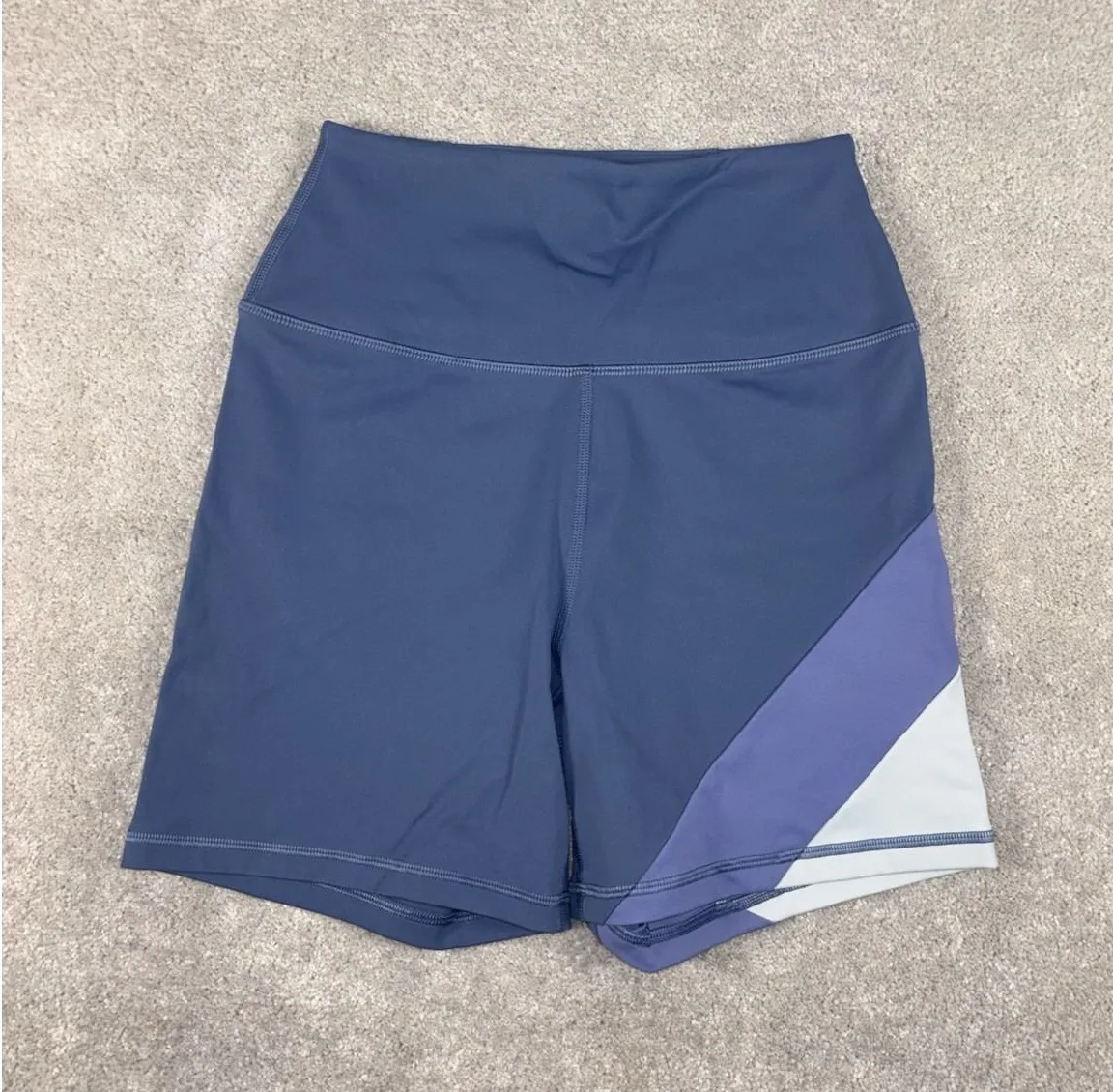 The product is a pair of Spiritual Gangster biker shorts in a vibrant blue color with a colorblock d... Show more