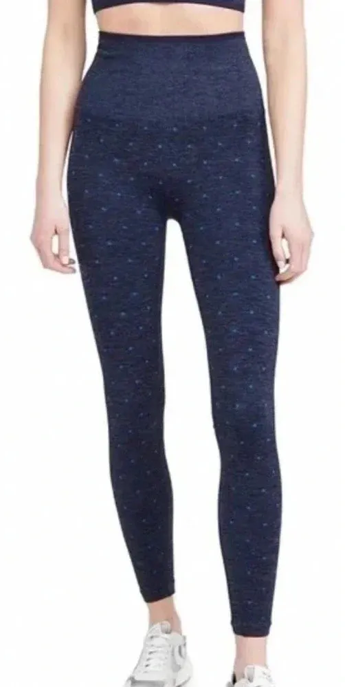 Splits59 Mika High Waist Polka Dot Seamless Leggings in Blue Navy blue with subtle polka dot pattern Seamless Pull-on Size M/L 78% polyester 16% nylon 6% spandex Waist is approx 12.5" Front rise is approx 11" Inseam is approx 25"