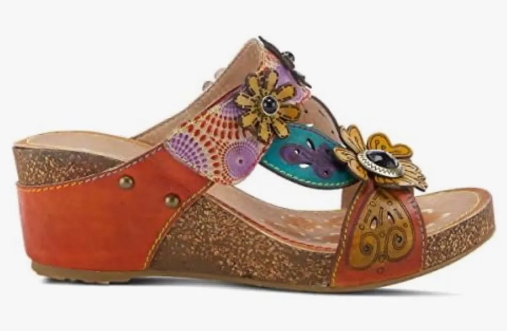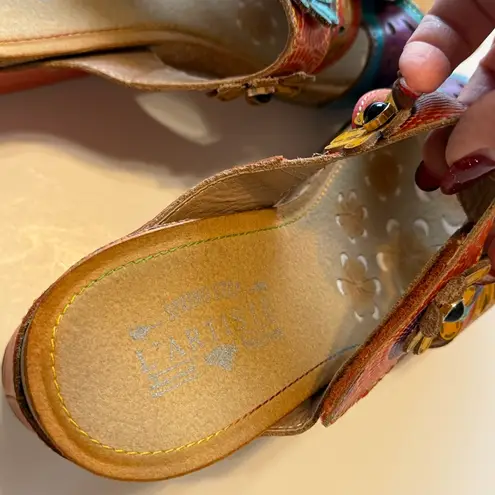 Spring Step L'Artiste Women's Adelanda Slide Sandal leather, Colorful floral leather appliquee, bohemian aesthetic , sz 8 Size 39 / size 8 US Adjustable at instep L'Artiste Style: Adelanda Unique detailed embossed and laser cut-out leather slide sandal with flower motives and a hook and loop closure for adjustability on a cork infused wedge platform. Upper: Leather Outsole: Rubber Insole: Synthetic Closure: Hook&Loop Slip-on lightweight wedge sandal Very Comfy! Condition: gently worn, excellent condition, slight wire signs on the rubber bottom and the left shoe at the heel (some dark rubbing)-see photos and video for details) No box Smoke/pet free home Ships asap! #shbx