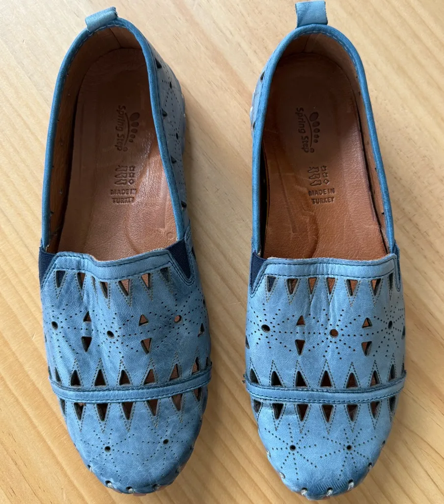 Rubber outsole Featuring a leather upper with cutout details, this round-toe, slip-on Spring Step® Fusaro loafer will be your new laid-back favorite. Easy slip-on wear with side-goring means an optimal fit every time. Leather lining and footbed for great next-to-foot feel. Excellent preowned condition