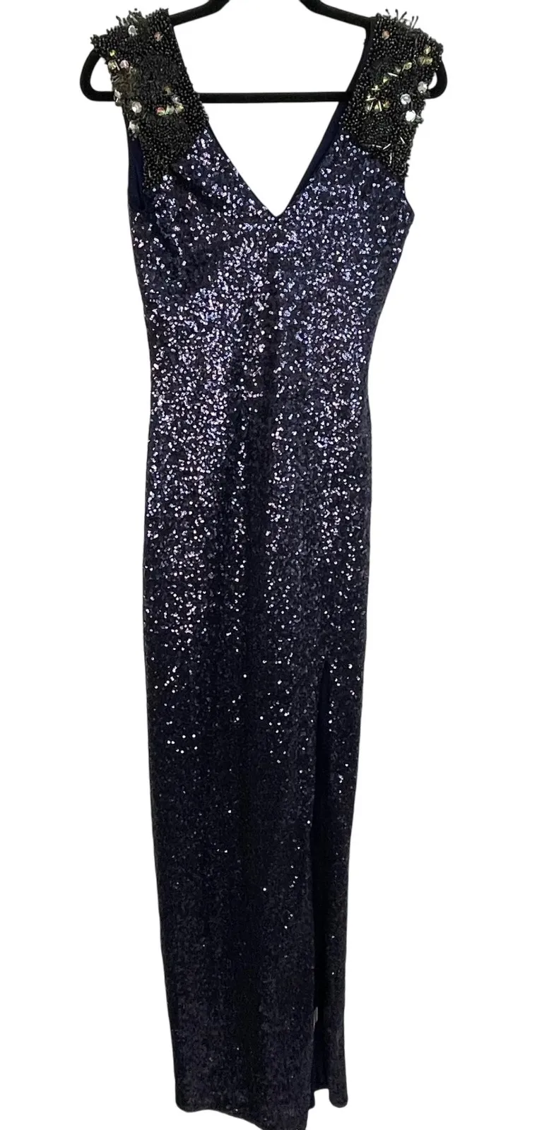 Old Hollywood Glamour New Years Eve Turn heads and sparkle under the moonlight in this breathtaking navy blue sequin maxi gown. The illusion of cascading starlight adorns your silhouette, while the intricately beaded shoulder embellishments catch the light with every move, adding a touch of opulent glamour. Style: Maxi, Bodycon Dress Length: Long Department: Women Sleeve Length: Sleeveless Occasion: Formal, Party/Cocktail, Wedding Material: Nylon Blend, Polyester Blend Theme: Designer, Glamour, Party Neckline: V-Neck Season: Fall, Spring, Summer, Winter Sleeve Type: Cap Sleeve Measurements: Pit to Pit: 14" Sleeve: 8" Length: 61" Keywords: Navy blue maxi dress, Sequin gown, Embellished dress, V-neck dress, Thigh-high slit, Formal dress, Evening wear, Party dress, Special occasion dress, Glamorous dress, Sparkly dress, Beaded shoulders, SPY Zone Exchange dress, Size S dress