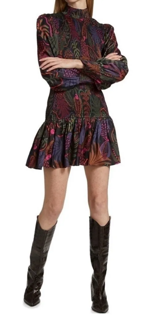 FARM Rio Frutis Dress Smocked Long Blouson Sleeve Drop Waist Multi Color Size XS Black - $60 - From M