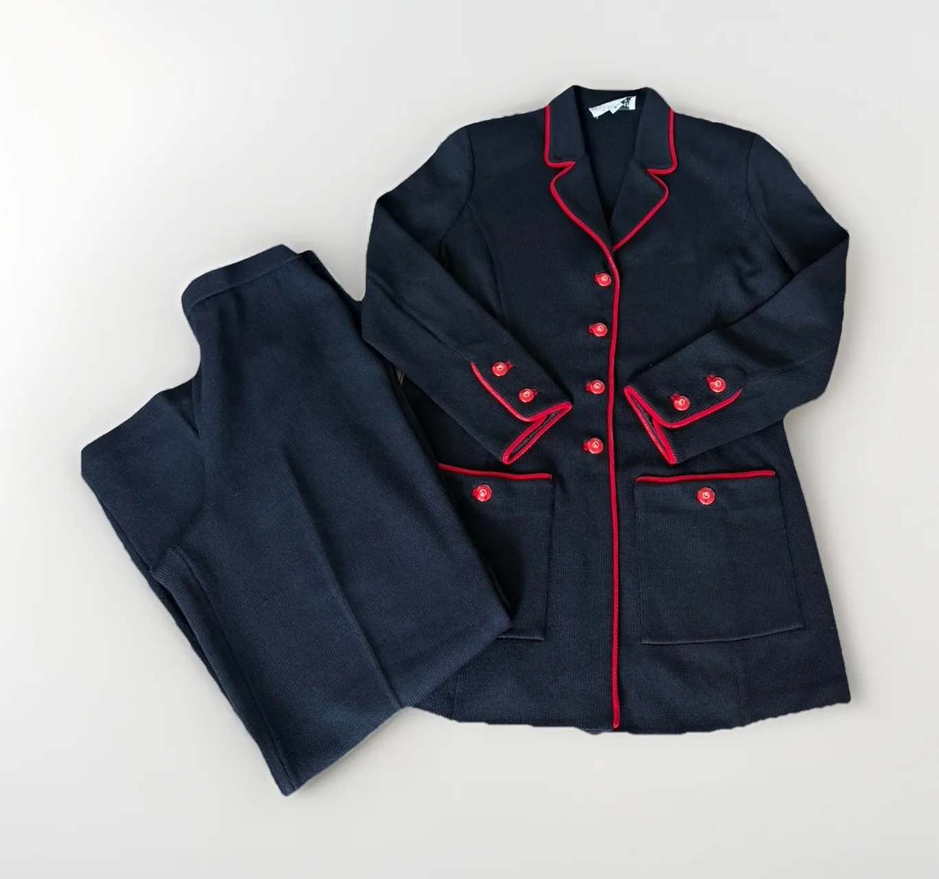 The St. John Collection 2 Piece Suit in Marie Gray Santana Knit Size 8 is a stylish and sophisticated outfit perfect for wear to work. This pant suit features a wide leg design with an elastic waist for a comfortable fit. The jacket is a regular length with a single-breasted front and four-button closure. Made from a cozy cotton blend fabric in a blue shade, this vintage-inspired suit exudes designer elegance and is ideal for the fall and winter seasons.