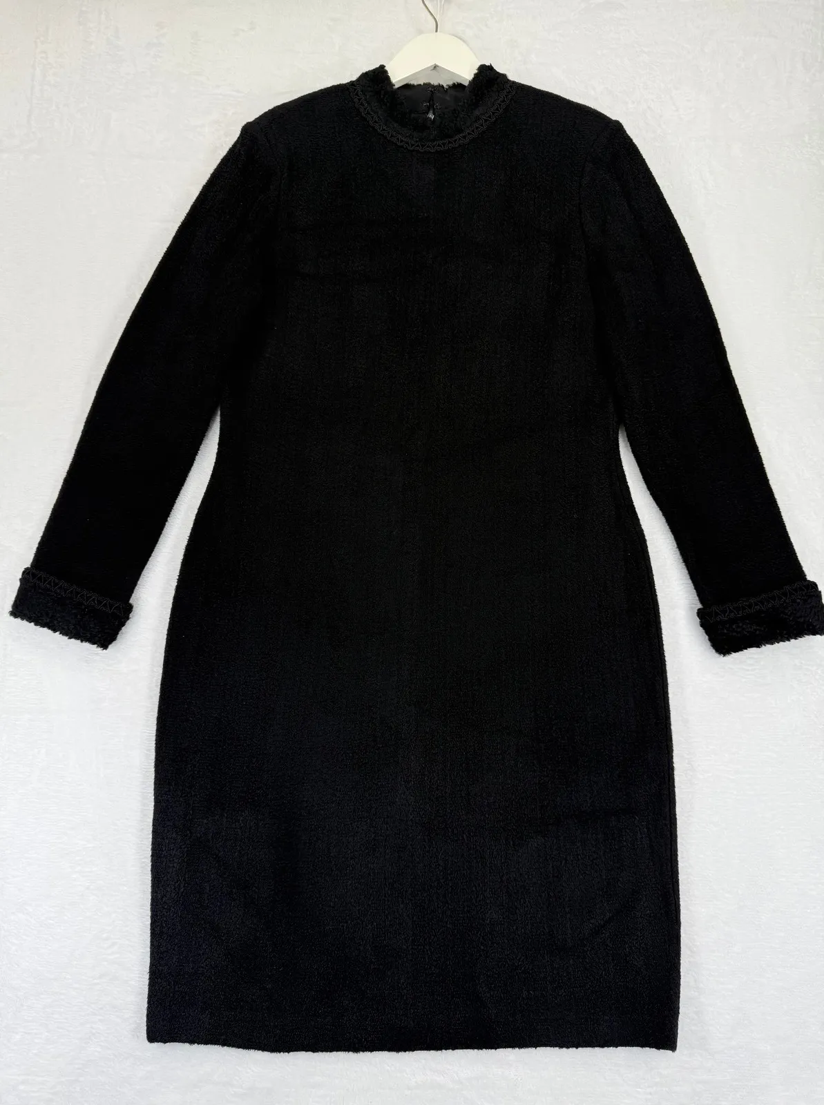 Measurements: • Bust: 18 in • Waist: 17 in • Length: 39 in • Sleeve Length: 23 in Style: Sheath, Sweater Dress Dress Length: Knee Length Department: Women Sleeve Length: Long Sleeve Pattern: Solid Occasion: Casual, Workwear Material: Faux Fur, Polyester Blend Fabric Type: Fleece Neckline: High Neck Season: Fall, Winter Sleeve Type: Long Sleeve Closure: Zip Accents: Fur Trim Features: Collarless Keywords: ST. JOHN, sheath dress, textured, fur trim, black dress, elegant, sophisticated, professional, career wear, evening wear, winter dress, classic, designer dress, high neck, gothic, capsule wardrobe, closet staple, fairy goth Thank you for viewing my listing! Please see the photos for a detailed look at its CONDITION and MEASUREMENTS. Feel free to reach out with any questions.