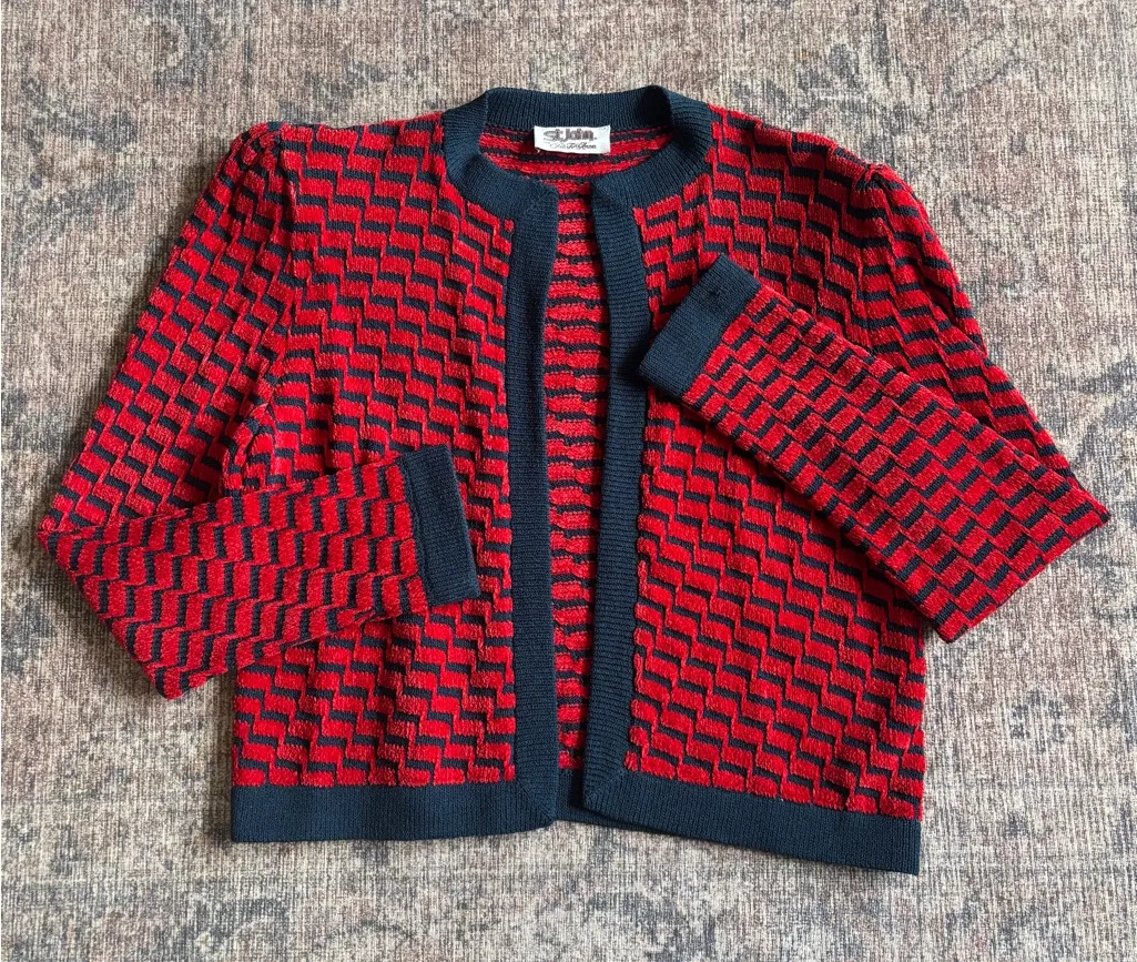 Gorgeous red and navy blue geometric pattern vintage St. John for Saks Fifth Avenue sweater cardigan with long sleeves and top hook and eye closure Women’s size 10 See photos for measurements Has shoulder pads Made in the USA Dry clean only Materials unknown but had a very soft knit almost velvet feel Very small hole in the back of the left sleeve cuff - not noticeable when worn. Price reflects minor flaw - otherwise in excellent vintage condition! #vintagecardigan #stjohn #saks #valentinesday