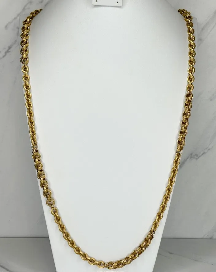 Brand: St. John 🤍 Color: Gold Tone 👗 Style: Opera Length Statement Necklace Gorgeous designer chain necklace from St. John featuring their signature embossed text links reading "ST JOHN," "PALM BEACH," and "NEW YORK" throughout, plus the iconic SJ logo charm! This opera-length beauty is perfect for layering or doubling for a chic choker look. Details: - Length: 46 inches - Width: 0.4 inches at widest point - Weight: 6.7 oz (substantial quality piece) - Textured links embossed with "ST JOHN," "PALM BEACH," "NEW YORK" - Smooth chain link sections - SJ logo charm pendant - Lobster clasp closure Condition: Preowned. Light corrosion visible in a few areas (please see photos). Overall good condition with normal wear. Layer this luxe designer piece over turtlenecks or let it shine solo with a simple LBD! The embossed text detail makes it an instant conversation starter. 💫 B9309