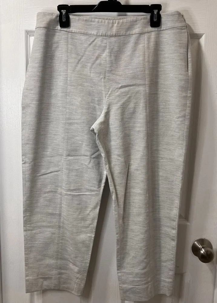 The flar waist measurement is 18". These pants have a side zipper closure and are tapered. All items are packed and shipped within 24 hours. All items are sent in a poly bag unless otherwise noted. Elevate your casual wardrobe with these sophisticated St. John pants in a versatile light gray. Perfect for both lounging and smart-casual occasions, these pants feature a comfortable elastic waist and a relaxed silhouette. The lightweight fabric offers excellent drape and movement, making them ideal for travel, weekend brunches, or casual office days. Their timeless design pairs beautifully with both dressy and casual tops. Keywords: st john pants, elastic waist pants, gray pants, casual pants, comfortable pants, designer pants, pull on pants, light gray pants, relaxed fit pants, luxury casual wear
