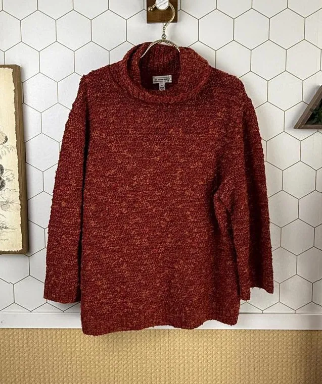 Measurements are approximate and given for reference. P2P: Approximately 22 inches Length: Approximately 26 inches Size: XL Condition: Lightly worn with no visible signs of wear or damage. Cozy and stylish red turtleneck sweater from Coldwater Creek. Textured knit fabric provides warmth and comfort. Relaxed fit with long sleeves and a soft turtleneck collar. Perfect for layering in cooler weather or wearing on its own.