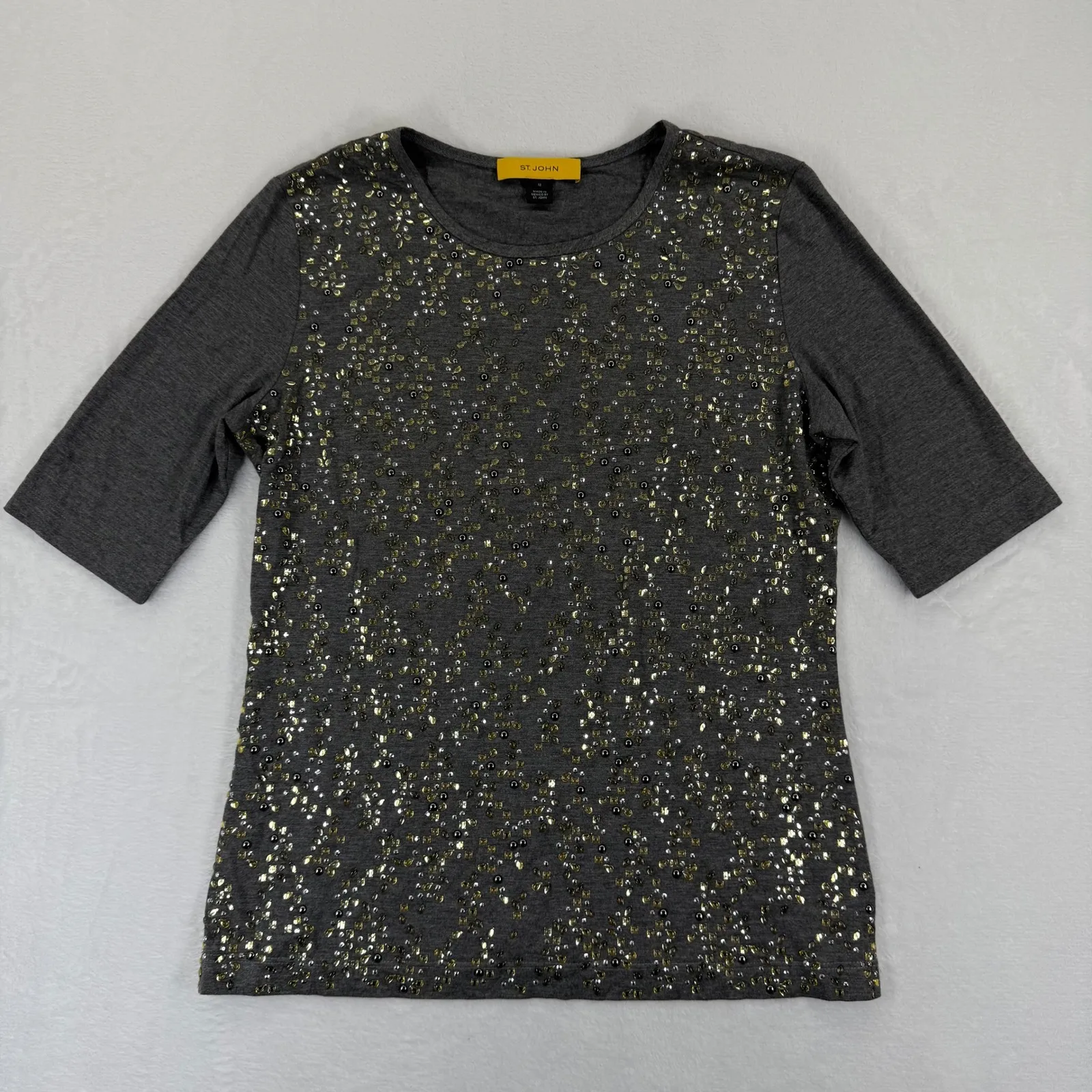 Type: T-Shirt Department: Women Style: Basic Material: Rayon, Spandex Neckline: Round Neck Sleeve Length: 3/4 Sleeve Sleeve Type: Classic/Fitted Sleeve Pattern: Solid Accents: Sequin Fit: Regular Fabric Type: Jersey Occasion: Casual, Party/Cocktail Closure: Pullover Season: Spring, Summer, Fall, Winter Keywords: St John, gray top, sequin detail, embellished, 3/4 sleeve, women's fashion, party wear, glamorous, designer, luxury, elegant, special occasion Thank you for viewing my listing! Please see the photos for a detailed look at its CONDITION and MEASUREMENTS. Feel free to reach out with any questions.