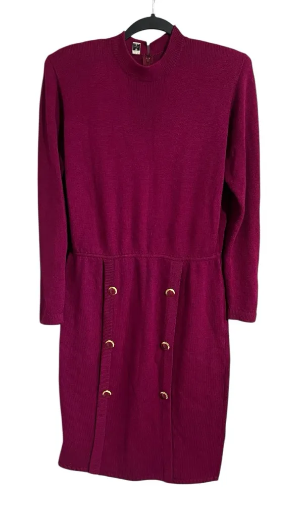 Size 10 Elegant magenta dress featuring long sleeves and stylish button accents. Perfect for any occasion. Shoulder padding 42.5” length,19” pit-pit, 17” shoulder-shoulder, 24” sleeve