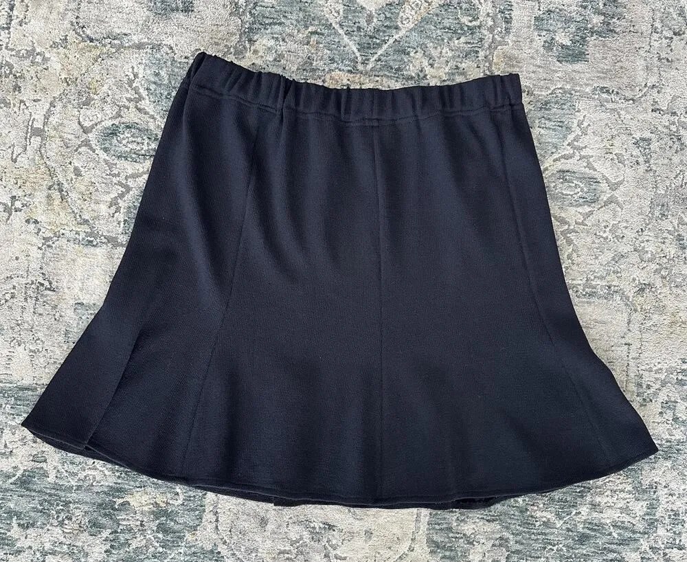 St John Skirt 14 Black Santana Knit Godet Flared A Line Mini Wool Elegant USA Condition: Pre-owned — gently worn, no visible flaws Brand: St. John Collection Tag size: 14 (Womens) Color: Black Made in U.S.A. (per tag) Knit fabric A-line silhouette with flared hem Pull-on elastic waistband Seamed panel construction