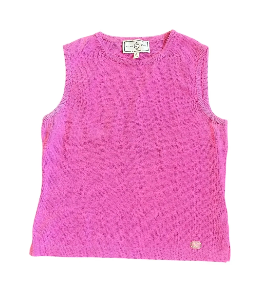 St John Sport knit sleeveless tank top by Marie Gray in a vibrant pink hue. This refined piece offers a classic silhouette, perfect for layering or wearing on its own. The textured knit provides a sophisticated feel, while the iconic St John logo detail adds a touch of luxury. A versatile addition to any wardrobe, this top combines comfort with timeless style. Measurements: • Bust: 17 in • Length: 22 in Type: Tank Department: Women Style: Basic Material: Wool, Rayon Neckline: Crew Neck Sleeve Length: Sleeveless Sleeve Type: Classic/Fitted Sleeve Pattern: Solid Accents: Embroidered Theme: Classic Features: All Seasons Fit: Regular Fabric Type: Knit Occasion: Casual Closure: Pullover Season: Summer, Spring Keywords: St John Sport, Marie Gray, pink knit, sleeveless, tank top, designer knit, luxury knit, preppy, classic, wardrobe staple, layering piece Ships fast from pet & smoke free home. offers welcome! Please review all photos.